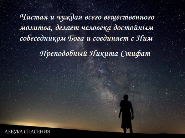 Ничто другое так, как чистая и чуждая всего вещественного молитва, не делает человека достойным собеседником Бога и не соединяет с Ним того, кто словом молится Ему нерассеянно в духе, когда притом душа его омывается слезами, услаждается сладостью умиления и светом Духа Святаго просвещается.