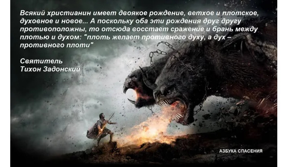 Всякий христианин имеет двоякое рождение, ветхое и плотское, духовное и новое, и одно другому противоположное. Плотское рождение есть плоть, духовное есть дух. Рожденное от плоти есть плоть, а рожденное от Духа есть дух (Ин.3:6). А поскольку оба эти рождения друг другу противоположны, то отсюда восстает сражение и брань между плотью и духом: плоть желает противного духу, а дух – противного плоти (Гал.5:17). Плоть хочет умертвить дух, дух же плоть. Плоть хочет гордиться, величаться, возноситься, дух же не хочет, но хочет смиренномудрствовать.