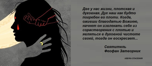 Две у нас жизни, плотская и духовная. Дух наш как будто погребен во плоти. Когда, оживши благодатью Божиею, начнет он извлекать себя из сорастворения с плотью и являться в духовной чистоте своей, тогда он воскресает или воскрешает себя часть за частью. Когда же он всего себя исторгнет из этой связности, тогда исходит, как из гроба, в обновленной жизни, и, таким образом, дух становится, сам по себе жив и действен, а гроб плоти сам по себе мертв и бездействен, хотя то и другое в одном и том же лице. И вот тайна того, что говорит апостол: где Дух Господень, там свобода (2Кор.3:17).