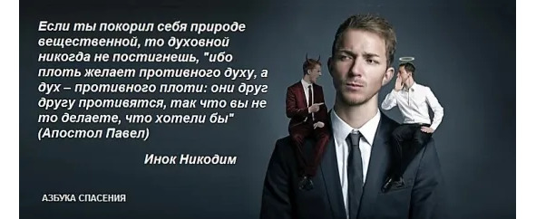То, что в ветхом человеке, рождающемся в падшем мире, дух противится плоти, а плоть духу, хорошо известно каждому. Еще блаженный Павел, раб Христов и великий церковный учитель засвидетельствовал это в своем послании к Римлянам: