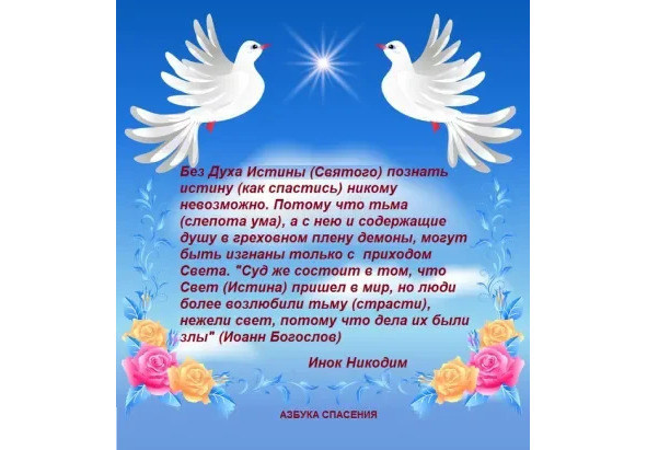 Когда же приидет Он, Дух истины, то наставит вас на всякую истину: ибо не от Себя говорить будет, но будет говорить, что услышит, и будущее возвестит вам. Он прославит Меня, потому что от Моего возьмет и возвестит вам. Все, что имеет Отец, есть Мое; потому Я сказал, что от Моего возьмет и возвестит вам (Ин.16:13—15).