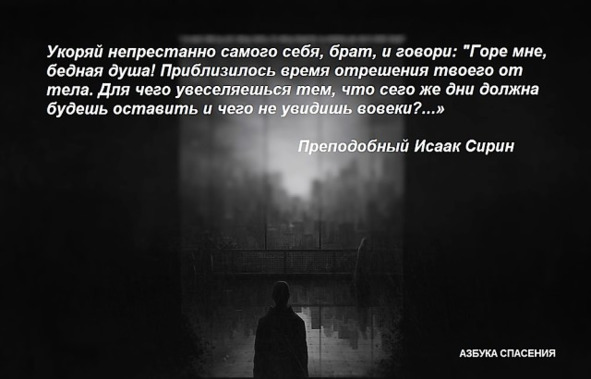 Укоряй непрестанно самого себя, брат, и говори: «Горе мне, бедная душа! Приблизилось время отрешения твоего от тела. Для чего увеселяешься тем, что сего же дни должна будешь оставить и чего не увидишь вовеки?» Преподобный Исаак Сирин