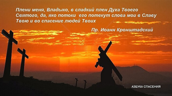 Плени меня, Владыко, в сладкий плен Духа Твоего Святого, да, потекут слова мои в Славу Твою и во спасение людей Твоих. Даруй мне это сладкое и могущественное внутреннее побуждение излагать свободно на хартии полноту духовных видений и чувств. Да будет язык мой ( Духа Всесвятого. яко потоки югом (Пс.125:4) тростию книжника скорописца Пс. 44:2) —