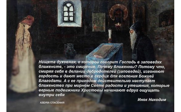 Нищий не имеет ничего, а всего ищет у других, и, как милости, просит необходимаго для жизни, как-то: пищи, одежды, жилища. Если дух твой, воспоминая райское жилище, из которого он в прародителях изгнан, райскую одежду света, от которой грехом обнажен, райскую пищу от древа жизни, которой лишен, чувствует себя в крайней скудости всякого добра, и в опасности умереть вечною смертию, а потому непрестанно прибегает и припадает к Богу, ищет и просит себе духовнаго жилища – в Церкви Его, духовной одежды – в благодати Сына Его Иисуса Христа, дабы, в Него крестившись, в Него и облещись, духовной пищи – во всяком слове, исходящем из уст Божиих: по таковым расположениям Бог, богатый милостию, видит и приемлет тебя, как нищего духом, и, даруя тебе просимые блага, дарует в них самое царствие Божие. Признавать, что в нас, и для нас в мире, нет истинного духовного блага, и усердно просить духовной милости от Подателя всех благ Бога есть дело нищего духом. Смиренная молитва и молящееся смирение составляют нищету духа.