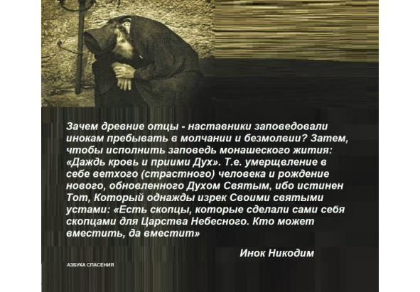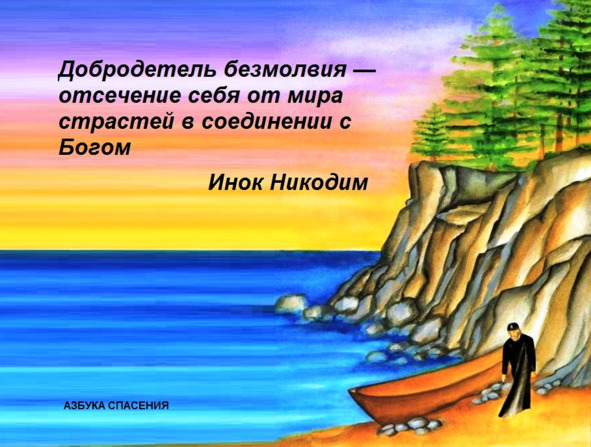 Добродетель безмолвия – это отсечение себя от мира плотских страстей и соединение с Богом. Таков закон Духа, ибо неложен Тот, Который заповедал: Никто не может служить двум господам: бо, или одного будет ненавидеть, а другого любить, или одному станет усердствовать, а о другом нерадеть. Не можете служить Богу и маммоне (Мф.6:24).