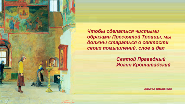 Чтобы сделаться чистыми образами Пресвятой Троицы, мы должны стараться о святости своих помышлений, слов и дел. Мысль соответствует в Боге – Отцу, слова – Сыну, дела – Духу Святому всесовершающему. Грехи помышления в христианине – немаловажное дело, потому что все угождение наше Богу заключается, по свидетельству св. Макария Египетского, в помышлениях: ибо помышления суть начало, от них происходят слова и деятельность, – слова, потому что они или дают благодать слышащим, или бывают словами гнилыми и служат соблазном для других, растлевают мысли и сердца других, дела тем более, потому что примеры сильнее всего действуют на людей, увлекая к подражанию им.