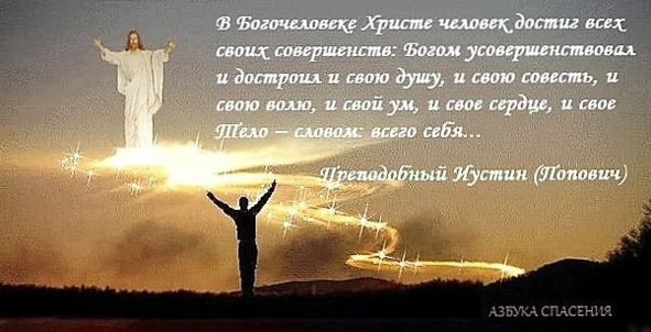 Без Богочеловека человек – это, в действительности, человек без головы и еще без самого себя – вечного и бессмертного, без себя – богоподобного. Вне Богочеловека нет человека, но есть существо ниже человека, нечеловек. Кто же без Богочеловека человек? – всегда раб смерти, греха и диавола. Только Богочеловеком человек и достигает поставленной Богом цели: становится богом по благодати, и этим достигает совершенной полноты своего существа и своей личности. Он достигает своей Божественной вечности через Богочеловечность, живя в Богочеловеческом Теле Церкви «со всеми святыми», становясь богочеловеком по благодати через святые таинства и святые добродетели. И окрыляет его радость слов святого Василия Великого: «Человек – это существо, которому приказано стать богом».