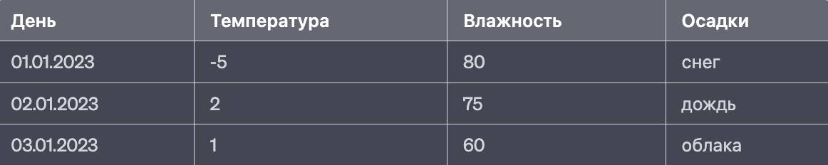 В данном примере каждая строка – это наблюдение (день), а столбцы – признаки (температура, влажность и осадки). В зависимости от типа данных признаки могут быть числовыми, категориальными или текстовыми.