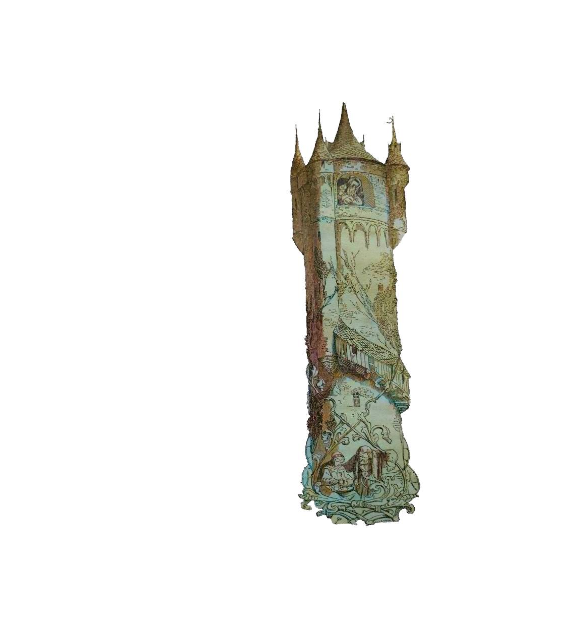 Wulfild vernahm die Stimme ihres Vaters, ließ ihr Schweißtüchlein zum Wagen hinauswehen und gab damit das Zeichen des Abschieds. Die Eltern waren bestürzt über den Verlust ihrer Tochter und sahen einander stumm und staunend an. Mama traute gleichwohl ihren Augen nicht und hielt die Entführung für Blendwerk und Teufelsspuk, ergriff ein Bund Schlüssel und lief in den Turm, öffnete die Tür zum kleinen Zimmer, fand aber ihre Tochter nimmer, auch nichts von ihrer Gerätschaft. Doch lag auf dem Tischlein ein silberner Schlüssel, den sie zu sich nahm, und als sie von ungefähr durch die Luke blickte, sah sie in der Ferne eine Staubwolke gegen Sonnenaufgang emporwirbeln und hörte das Getümmel und Jauchzen des Brautzugs bis zum Eingang des Waldes. Betrübt stieg sie vom Turm herab, legte Trauerkleider an, bestreute ihr Haupt mit Asche, weinte drei Tage lang, und Gemahl und Tochter halfen ihr wehklagen. Am vierten Tage verließ der Graf das Trauergemach, um frische Luft zu schöpfen, und wie er über den Hof ging, stand da eine feine, dichte Kiste von Ebenholz, wohlverwahrt und schwer zu heben. Er ahndete leicht, was drinnen sei, die Gräfin gab ihm den Schlüssel, er schloss auf und fand einen Zentner Gold.