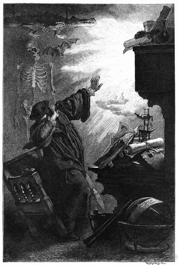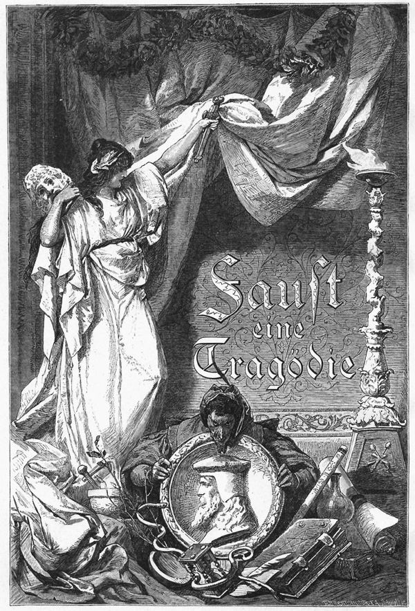 In einem hochgewölbten, engen, gothischen Zimmer Faust unruhig auf seinem Sessel am Pulte.