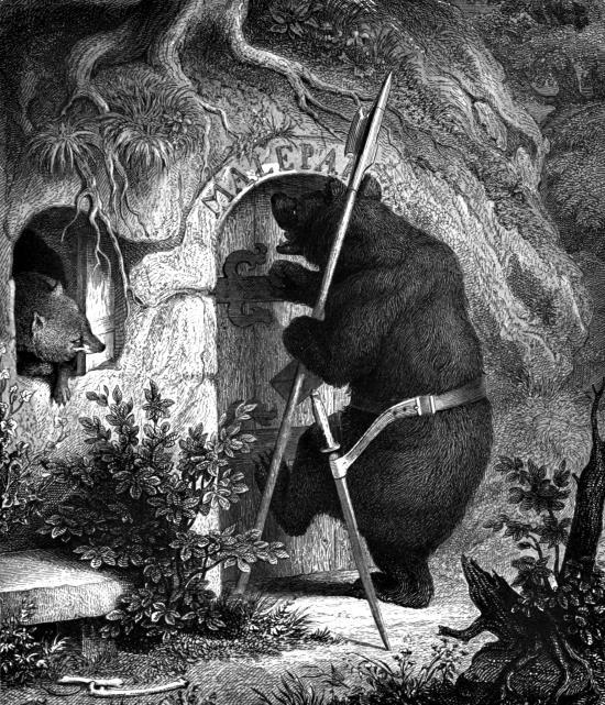 Гордо шел Браун-медведь, направляясь к горам через обширную песчаную дикую степь. Вот он, наконец, прошел ее и стал подходить, не торопясь, к тем горам, где Рейнеке охотился летом. Как Браун слышал, всего лишь день тому назад он развлекался здесь. Не мешкая, однако, Браун направился в Малепартус, где были прекрасные владения у Рейнеке-лиса. Из всех его укреплений и замков Малепартус был главнейшим и лучшим. В нем именно и укрывался каждый раз Рейнеке, замышляя что-нибудь нехорошее. Приблизившись к замку, Браун заметил, что он был очень крепко заперт. Постояв и подумав около ворот, Браун обратился к Рейнеке-лису: