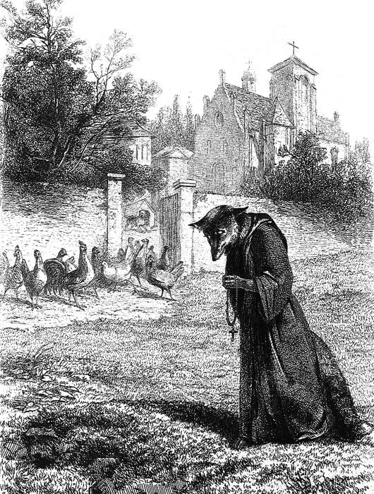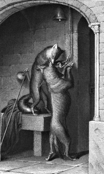 – Вы ошибаетесь, племянник, – отвечал лис, – не судите поспешно и не мешайте мне молиться. Я молитву читаю за упокой всех наседок, петухов и цыплят, которых я много похитил около этой обители, у этих почтенных монахинь.