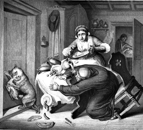 Я много подстроил ему несчастий, пинков и побоев. Научил его ловить рыбу, но горько досталась она ему. Раз пошел он со мною (там же все, в Юлихе дело было). Мы подкрались к жилью патера, а патер был богатый: полный амбар ветчины у него, сало красовалось целыми кусками и много было соленой рыбы в глубоком корыте. После долгих усилий Изегрим проделал себе лазейку в каменной стене. Подстрекая его жадность, я понукал его – и он пролез через отверстие, по-видимому, легко и свободно; но там, как видно, не выдержал и так наелся через меру, что не мог уже вылезти назад. Ах, как бранил он лазейку! Впустила голодного волка, а сытому, злая, не хочет дать обратного пропуска. Я же между тем поднял в деревне гвалт и тревогу – всех переполошил и навел на след находящегося в плену волка. Вот как я это устроил. Побежал прямо к патеру. Он сидел за обедом; жирный, чудно изжаренный каплун[5] едва дымился у него перед носом. Мигом схватил я каплуна и пустился бежать с ним что было мочи. Патер, рассердившись, бросился было за мною, да как-то впопыхах опрокинул стол со всеми кушаньями и посудой.