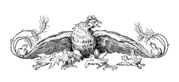 А сам думал о курах, гулявших в поле без присмотра. Гримбарт и лис прямехонько направились к беспечной птице. Тут хищные глаза у плута лиса совсем разбежались. Сильно приглянулся ему один откормленный петушок, гордо гулявший с другими. Нацелившись в него глазом, лис быстро подскочил к нему – и мигом перья полетели вокруг.