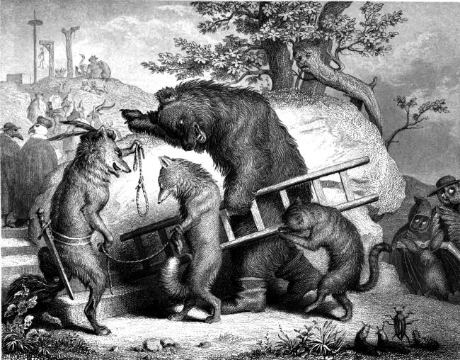 Но волк Изегрим, Гинце-кот и Браун-медведь с жаром хлопотали около узника, старались поскорее привести в исполнение наказание над своим врагом – и вывели Рейнеке в поле, где возвышался эшафот.