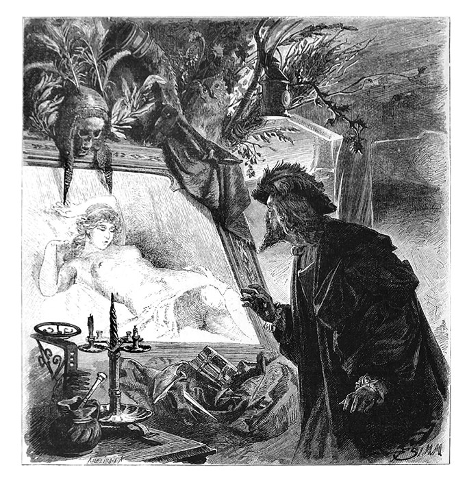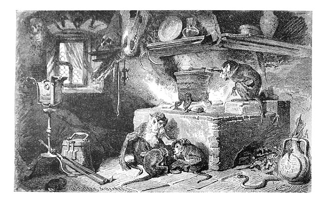 На низком очаге, на огне, стоит большой котел. В паре, поднимающемся кверху, виднеются различные образы. Мартышка-самка сидит у котла, снимает пену и смотрит, чтоб она не перелилась через край. Мартышка-самец с детенышами сидит подле и греется. Стены и потолок увешаны причудливою утварью ведьмы.