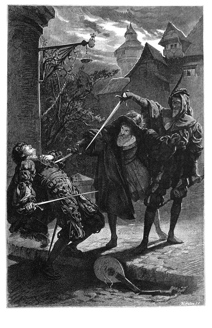 Черт побери! Кого ты тамСмущаешь, крысолов проклятый?Гитара к черту! К черту самСлетишь и ты, певец завзятый!МефистофельГитара сломана: ее не нужно нам!ВалентинТеперь и череп пополам!Мефистофель(Фаусту)