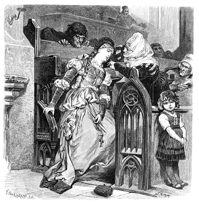 ЛизхенТы уж о Бербельхен слыхала?ГретхенНет. Я ведь дома все сижу одна.ЛизхенМы знаем кое-что! Сивилла мне сказала!Попалась наконец она!Вперед не важничай!ГретхенА что?ЛизхенДа дело скверно!Что ест она и пьет – двух кормит: это верно.ГретхенАх!ЛизхенДа, теперь награждена!На шею парню вешалась она:На все гулянья с ним ходила,С ним танцевала и кутила;Везде хотела первой быть,Есть пирожки да вина пить,Себя красавицей считала;Дошла в бесстыдстве до того,Что наконец уж от негоОткрыто брать подарки стала!Ласкала, нежила дружка, –Вот и осталась без цветка!ГретхенБедняжка!ЛизхенТы еще жалеешь!А мы? Как мать велит, бывало, прясть, –Сидишь да ночью вниз сойти не смеешь;Она же мигом к миленькому – шасть!Там, на скамье, иль в переулке темном,Не скучно было в уголке укромном!Теперь вот пусть свою убавит спесьДа перед нами в церкви грех свой весьВ рубашке покаянной пусть расскажет!ГретхенЕе он замуж взять, наверно, не откажет.ЛизхенДержи карман! Нет, парень не дурак:Получше может заключить он брак.Да он уж и удрал.ГретхенОн поступил нечестно.ЛизхенДа хоть женись – не очень будет лестно.Ей наши парни разорвут венок,А мы насыпем сечки на порог!(Уходит.)