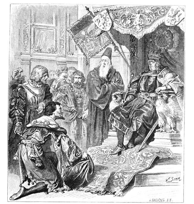 ИмператорПривет вам, други! Весь вполнеВокруг меня мой двор собрался.Мудрец со мной; куда ж девалсяДурак, мой шут, скажите мне?ЮнкерЗа вашим шлейфом он влачился,Упал при входе и разбился.Толстяк был поднят, унесен:Не знаю – пьян иль умер он.Другой юнкерЗа ним другой – откуда взялся,Не знаю – быстро протолкался.Одет был очень пышно он,Но безобразен и смешон.Уж он пробрался до чертога,Но алебарды у порогаПред ним скрестила стража тут.Да вот и он, наш смелый шут!Мефистофель(преклоняя колена перед троном)