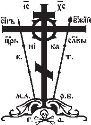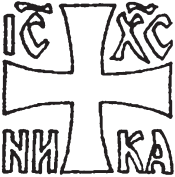 Равносторонний крест, дополненный монограммой «IC.XP.NIKA», что по-гречески означает «Иисус Христос – Победитель». Эта «просфорная» печать означает выкуп грешников из греховного плена.