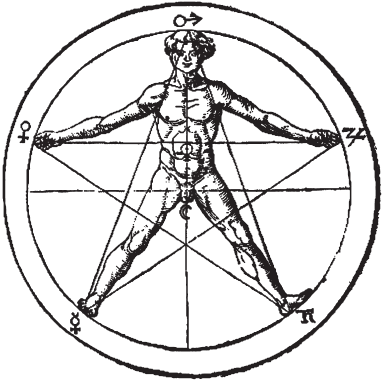 В эпоху Возрождения было популярно изображение пентаграммы со вписанной в нее человеческой фигурой, связанной с пятью элементами (как уже было сказано ранее: Огонь, Вода, Воздух, Земля, Эфир/Дух). Впервые это подметил в 1531 году знаменитый маг Корнелий Агриппа в своей книге «Оккультная философия. Том 2». Именно поэтому пентаграмма иногда называется «пентаклем Агриппы».