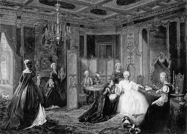17. Несмотря на то, что обычно Екатерину изображают в парадных платьях с огромными фижмами, чаще она одевалась совсем иначе: в просторные платья «молдаванского» или «русского» покроя без корсета и без фижм. Так она чувствовала себя намного комфортнее, к тому же тугие корсеты провоцировали желудочную колику, от которой императрица страдала с молодости.
