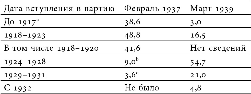 Несколько вновь назначенных секретарей принадлежали к старой партийной гвардии. Так, Краснодарский крайком ВКП(б) в 1939 году возглавил П. И. Селезнев, член партии с 1915 года, работавший в Московском комитете и в ЦК ВКП(б). Уникальной среди секретарей второго ряда была судьба партийного руководителя образованной в 1937 году Рязанской области С. Н. Тарасова. По основным критериям он входил в состав старых кадров: родился в 1893 году, вступил в партию в 1915‐м, в Гражданскую войну служил в Красной армии, в 1930‐х годах перешел на профсоюзную, а затем и на партийную работу в Москву. Тарасов пережил чистки 1937–1939 годов и продолжал работать в Рязани, а в 1945 году был назначен первым секретарем нового Измаильского обкома в Украине. Секретарь ЦК Компартии Таджикистана Д. З. Протопопов и секретарь обкома Коми АССР А. Г. Тараненко вступили в партию в 1917 году. Заметная группа новых секретарей влилась в партийные ряды в годы Гражданской войны. Однако, как видно из таблицы 1, более половины выдвиженцев, занимавших секретарские должности в начале 1939 года, пришли в партию в период нэпа, на волне борьбы с оппозициями и утверждения у власти фракции Сталина. Четверть секретарей имели партийный стаж с 1929 года. Это были коренные перемены.