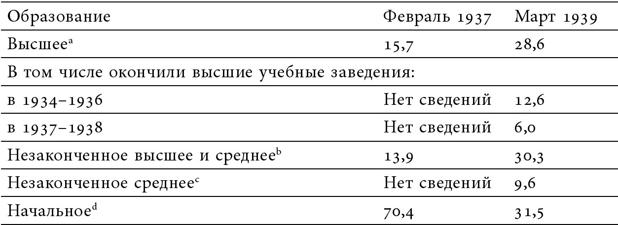 Составлено по: РГАСПИ. Ф. 17. Оп. 120. Д. 278. Л. 19–20; Ф. 477. Оп. 1. Д. 41. Л. 72 об. В 1937 году учитывались 166 первых и вторых секретарей обкомов, крайкомов и ЦК национальных компартий, в 1939 году – 333, это все секретари обкомов, крайкомов и ЦК национальных компартий (первые, вторые, третьи и секретари по пропаганде).