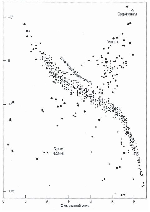 Будем изображать звезды точками на диаграмме Герцшпрунга – Рассела, где по оси абсцисс отложены спектральные классы (или соответствующие им показатели цвета), а по оси ординат – абсолютные величины, являющиеся мерой светимости соответствующих звезд (рис. 1). Из рисунка видно, что звезды лежат на этой диаграмме не беспорядочно, а образуют явно выраженные последовательности. Большинство звезд находится в пределах сравнительно узкой полосы, идущей от левого верхнего угла диаграммы к правому нижнему. Это так называемая главная последовательность звезд. В верхнем правом углу группируются звезды в виде довольно беспорядочной кучи. Их спектральные классы – G, К и М, а абсолютные величины находятся в пределах (+2) + (—6). Они называются красными гигантами, хотя среди них есть и желтые звезды. Наконец, в нижней левой части диаграммы мы видим небольшое количество звезд. Их абсолютные величины слабее +10, а спектральные классы лежат в пределах от В до F. Следовательно, это очень горячие звезды с низкой светимостью. Но низкая светимость при высокой поверхностной температуре может быть, очевидно, только тогда, когда радиусы звезд достаточно малы. Таким образом, в этой части диаграммы «спектр – светимость» находятся очень маленькие горячие звезды. Такие звезды называются белыми карликами. Именно о них речь шла в начале этой главы.