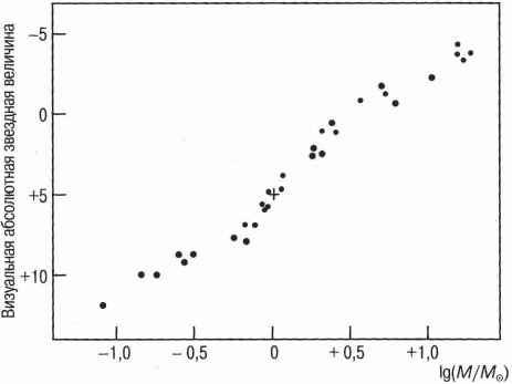 У звезд более поздних классов, чем Солнце, массы меньше солнечной. У карликов спектрального класса М массы примерно в 10 раз меньше, чем у Солнца. Так как вдоль главной последовательности и масса и светимость непрерывно меняются, между ними существует эмпирическое соотношение. На рис. 3 приведена зависимость между массой и светимостью для звезд главной последовательности.