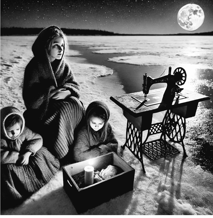 Der kalte Wind peitschte ihm ins Gesicht, als David das Pferd sicher durch die verschneiten Weiten führte. Amalia saß neben der Wiege und umfasste sie mit den Armen, als schütze sie das Einzige, was sie noch an ihr Zuhause erinnerte. Ihr Blick war leer, und ihre Lippen zitterten immer noch vor Kälte und Erschöpfung. Die Schwestern und der Bruder drückten sich dicht aneinander unter dem Pelzmantel, um sich zu wärmen.