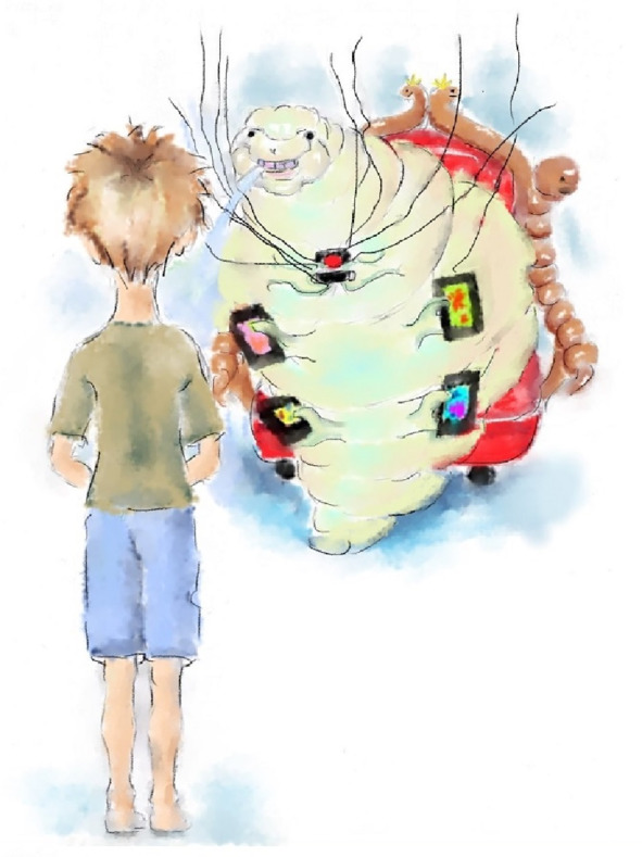 Ночью от обиды и злости на родителей он долго не мог заснуть, а когда, наконец, уснул – ему приснился странный сон: в большом, просторном зале с колоннами, где было много компьютеров, за которыми сидели в наушниках по большей части такие же мальчишки и девчонки как он, а в центре зала на большом красном мягком кресле, похожем на трон на колёсиках, сидел какой-то жирный, противный червь с множеством проводов, соединяющих его с пультом, от которого шли провода к компьютерам мальчишек и девчонок. В одной из его многочисленных маленьких, пухленьких конечностей с двумя пальцами был еще один пульт с большой красной кнопкой, а в остальных были всевозможные электронные и компьютерные гаджеты с играми и среди них была та самая, кото-рую Кирилл никак не мог закончить, червь же играл во все игры сразу. У мальчишки даже дыхание перехватило: «Ух ты, как здорово! Вот бы мне так научиться!» Червь повернулся к Кириллу, продолжая играть в игры, даже не глядя на них, и сказал: