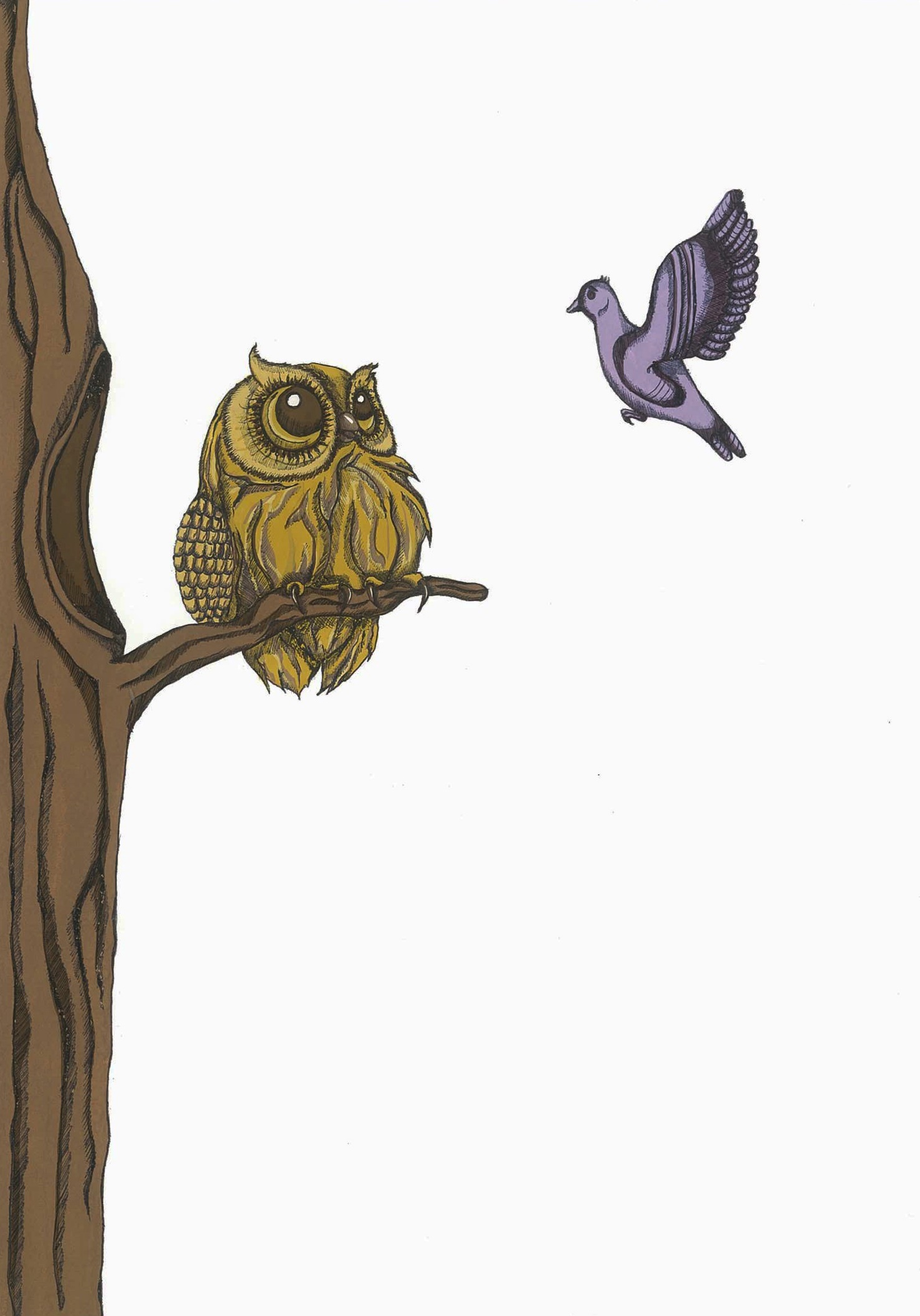 Голубь полетел к Сове. Но оказалось, что днем она крепко спит и не слышит ничего вокруг. Зайкин помощник присел на ветку и стал дожидаться вечера.