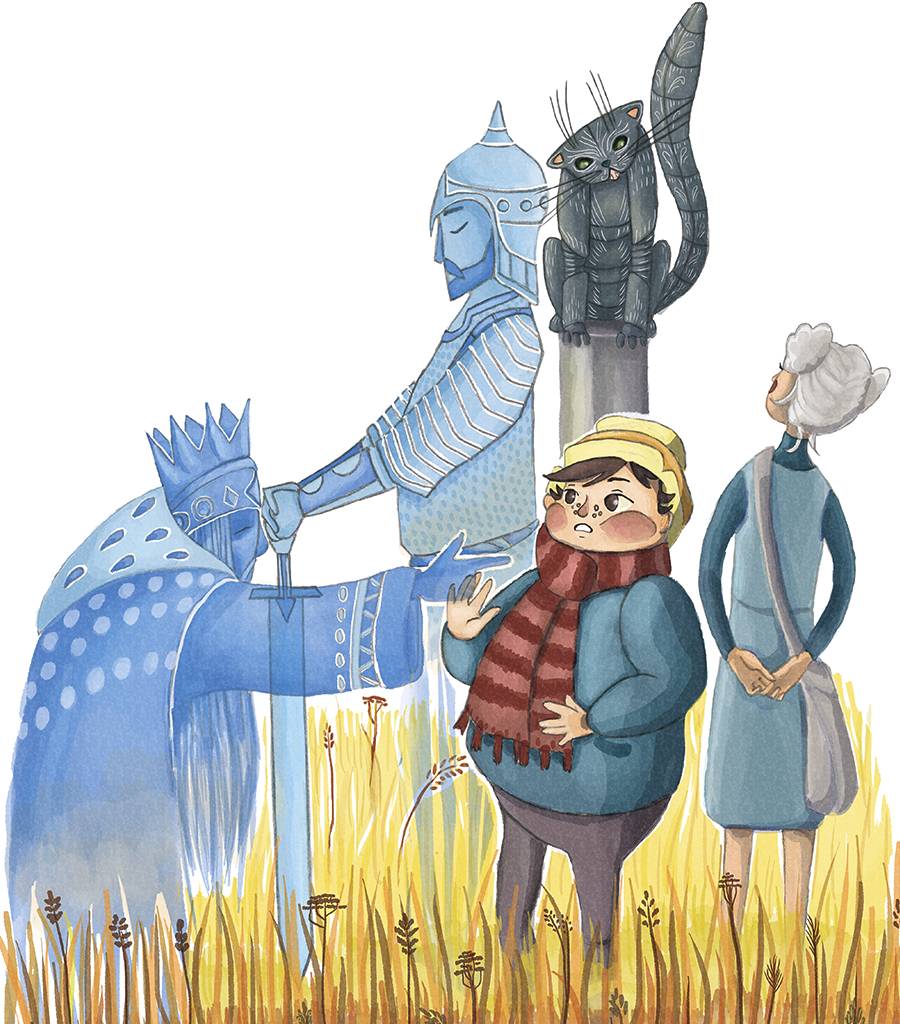 Ребята и пёсик оказались на полянке. Она походила на круг, который начертили циркулем. Пышные травы и осенние цветы тянулись к солнцу и щекотали пальцы рук. На полянке стоял столб. Это был железный брус высотой с человека. А на столбе спал кот. Здоровенный, но, кажется, самый обычный серый кот.