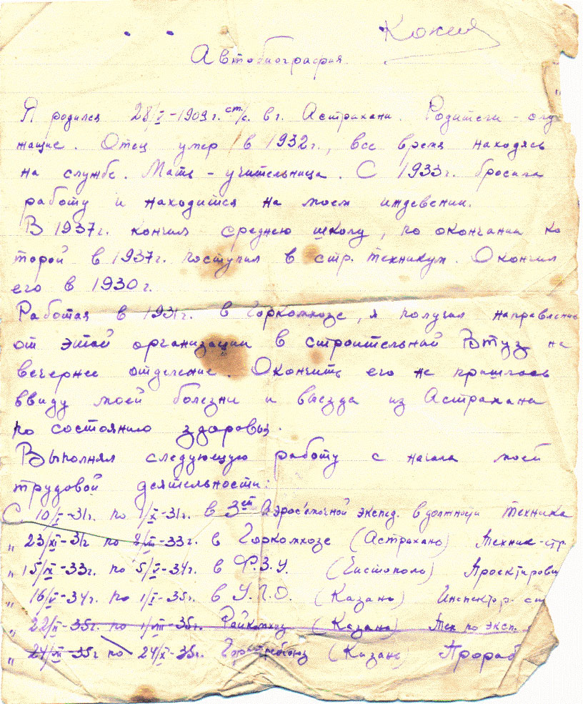 Отец мой, ветеринарный врач работает сейчас в г. Горьком в Верхне – Волжском пароходстве в качестве Старшего Вет – Сан – инспектора с 1930 года и по настоящее время. Мать всё время находилась на его иждивении.