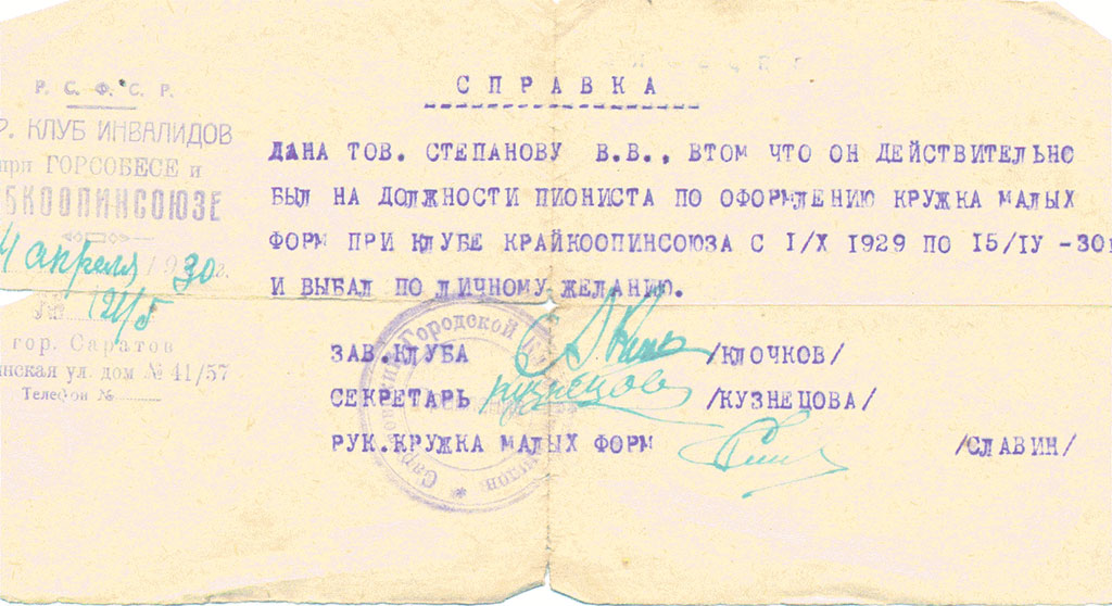Дана тов. СТЕПАНОВУ В. В. в том, что он при клубе Арт-полка 32 стр. дав. г. Саратова работая в качестве пианиста живой газеты, в работе муз. оформления газеты считаю очень хорошим и сильным, сопровождая музыкальную газету, так и кино с 13 марта по 12 апреля 1930 г., с работой справлялся и относился добросовестно.