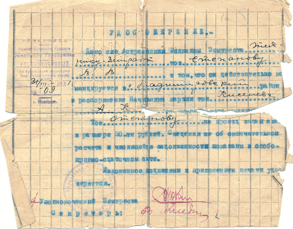 Дано сие Астраханским Земтрестом Начальнику Зем. работ тов. СТЕПАНОВУ В. В. в том, что он действительно командируется во Владимировский район в распоряжение начальника партии Киселёва А. К.