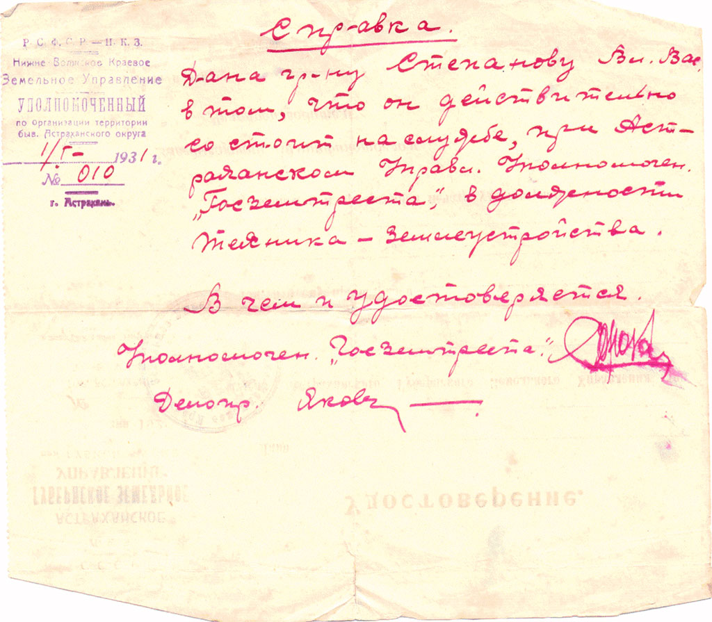 Дана настоящая гр. СТЕПАНОВУ ВЛ. ВАС. в том, что он действительно состоит на службе в Управлении при Астраханском Управлении Уполномоч. «Госземтреста» в должности техника – землеустроительства.