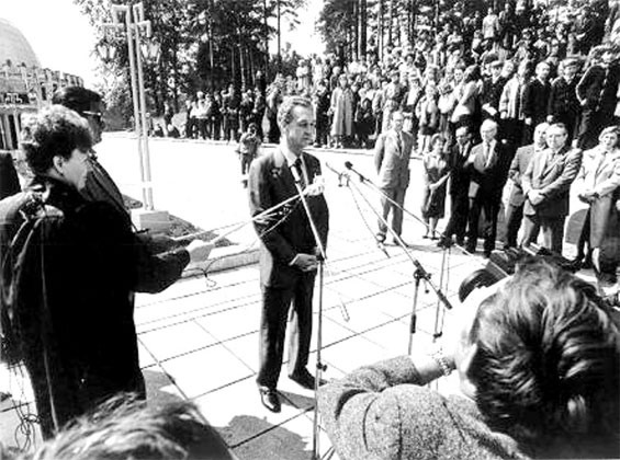 В. И. Севастьянов выступает на торжественном митинге жителей города Бийска по случаю открытия «Дома технического творчества молодежи имени Я. Ф. Савченко» 25 мая 1988 года.