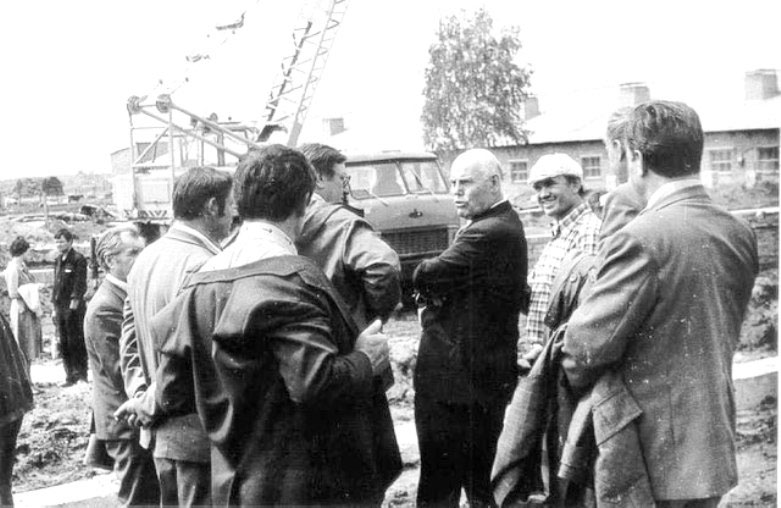 Подсобное хозяйство. Я. Ф. Савченко, контролируя ход строительства, умел учинять и спрос. Отчитывается начальник ОИС-5 Ю. Г. Белоногов – ведущий специалист в области измерительной техники.