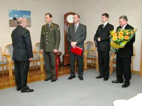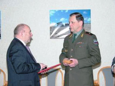 Момент поздравления с 65-летием Николая Александровича Макаровца представителями ФСБ в кабинете Н. А. Макаровца на территории ФГУП «ГНПП «Сплав». 22.03.2004 г.