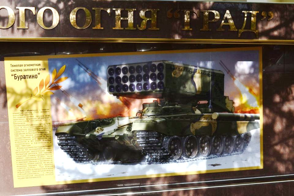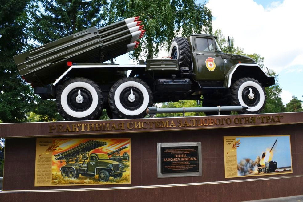 Изделие Сибприбормаша лежит внизу у колес установки. Этот памятник стоит у проходной завода.