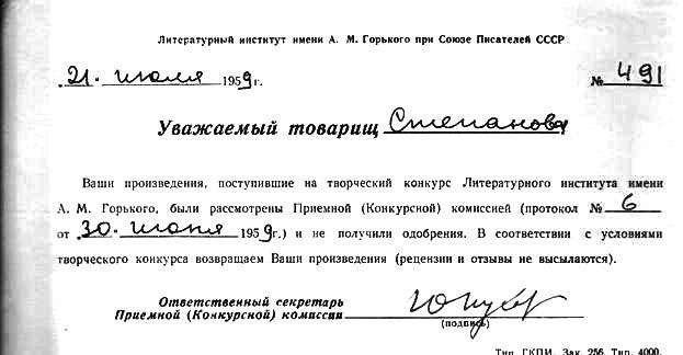 Это письмо – ответ, в котором говориться, что мои «произведения» не получили одобрения…