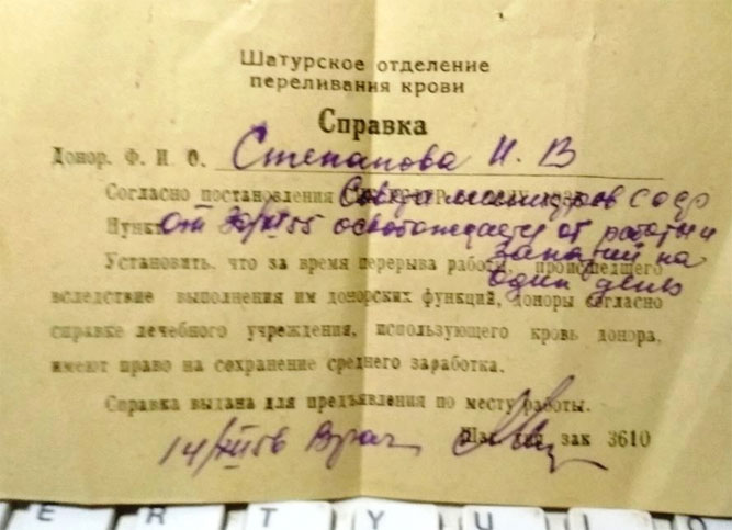 Такая справка давалась донору в день сдачи крови – для предъявления её на работе или в учебном заведении для того, чтобы получить освобождение от работы или учёбы. Работающим за этот не рабочий день начислялась средняя заработная плата.