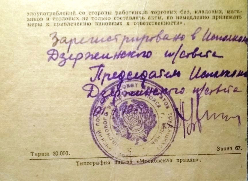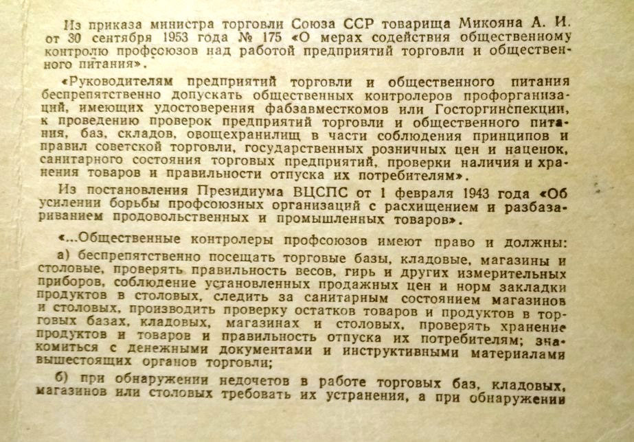 «Из Приказа министерства торговли Союза СССР товарища Микояна А. И. от 30 сентября 1963 года № 175 «О мерах содействия общественному контролю профсоюзов над работой предприятий торговли и общественного питания»