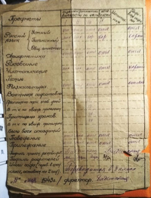 Есть сложенная пополам – половина листа, заполненного от руки – ТАБЕЛЬ об окончании 4-го класса.