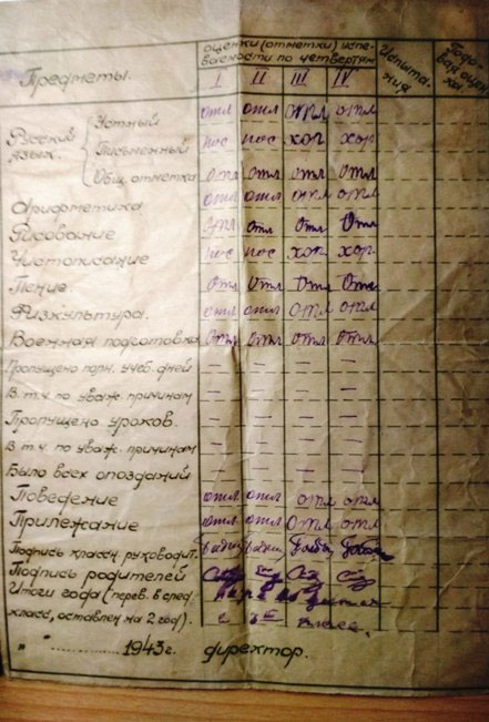 Интересно, что есть ещё второй такой же листочек с оценками, только без подписи директора и печати. Но в нём добавлены ещё предметы: