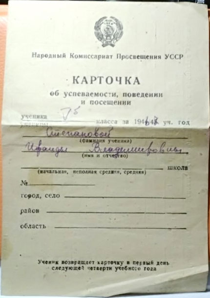 Таким образом, в учебном 46–47 году я опять училась в 5-м классе. Вот за этот год у меня тоже сохранилась – не ВЕДОМОСТЬ, а – КАРТОЧКА. На Украине форма документа об успеваемости была иной.