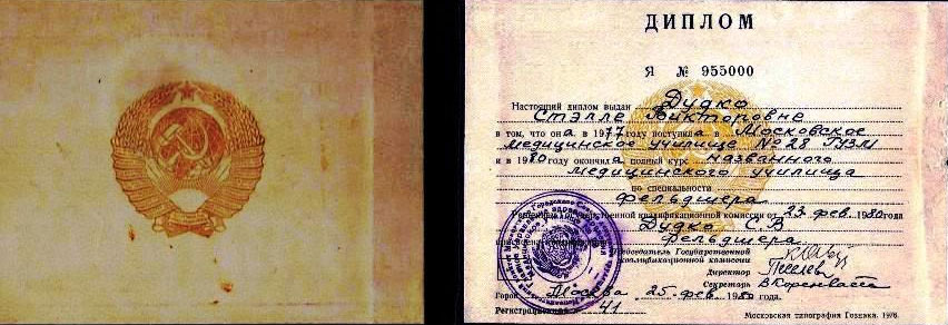 Окончив мед училище при институте Склифасовского, получила специальность – фельдшера.