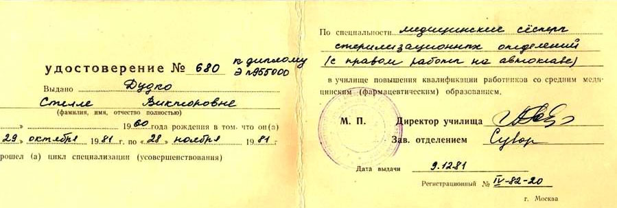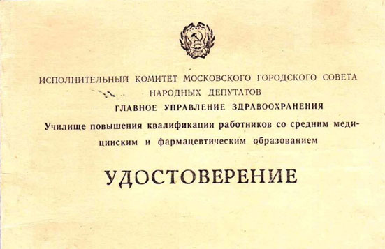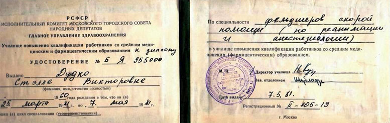 Затем, окончив училище повышения квалификации работников с медицинским и фармацефтическим образованием, получила УДОСТОВЕРЕНИЕ по специальности – ФЕЛЬДШЕР СКОРОЙ ПОМОЩИ (ПО РЕАНИМАЦИИ И АСТЕЗЕОЛОГИИ).